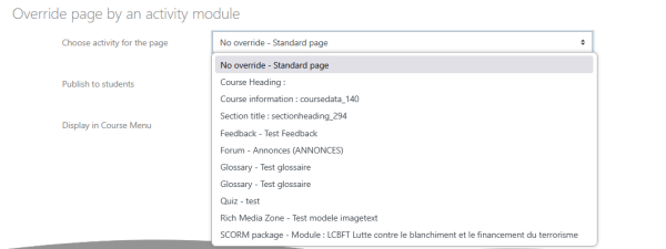 Note that in this list, all the course modules of the current course are available, wether they are published or NOT in pages. For very big courses, the further roadmap should examine a more scalable GUI to select activity (such; f.e. as searchable select).